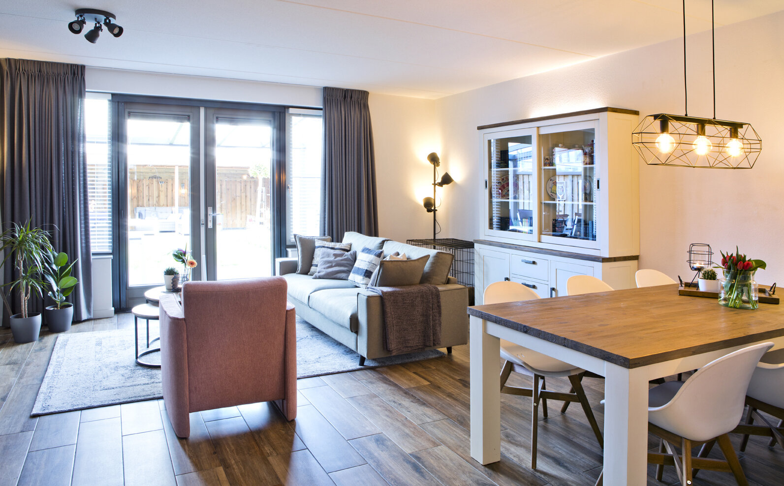 Het huis biedt volop mogelijkheden om thuis te werken, te studeren en muziek te maken. “Dankzij de uitbouw aan de achterkant hebben we een grote woonkamer en aan de voorzijde een keuken met eethoek. Ook in die keuken kan gewerkt worden met een laptop aan de eettafel. Aan de achterkant van de woning is een overkapping gemaakt, dus we kunnen eigenlijk overal lekker zitten en werken. De dubbele openslaande tuindeuren zorgen er bovendien voor dat we gemakkelijk van binnen naar buiten en andersom komen. Het loopt min of meer in elkaar over.” Als extra is er achter in de tuin ook nog een overdekte loungeplek!