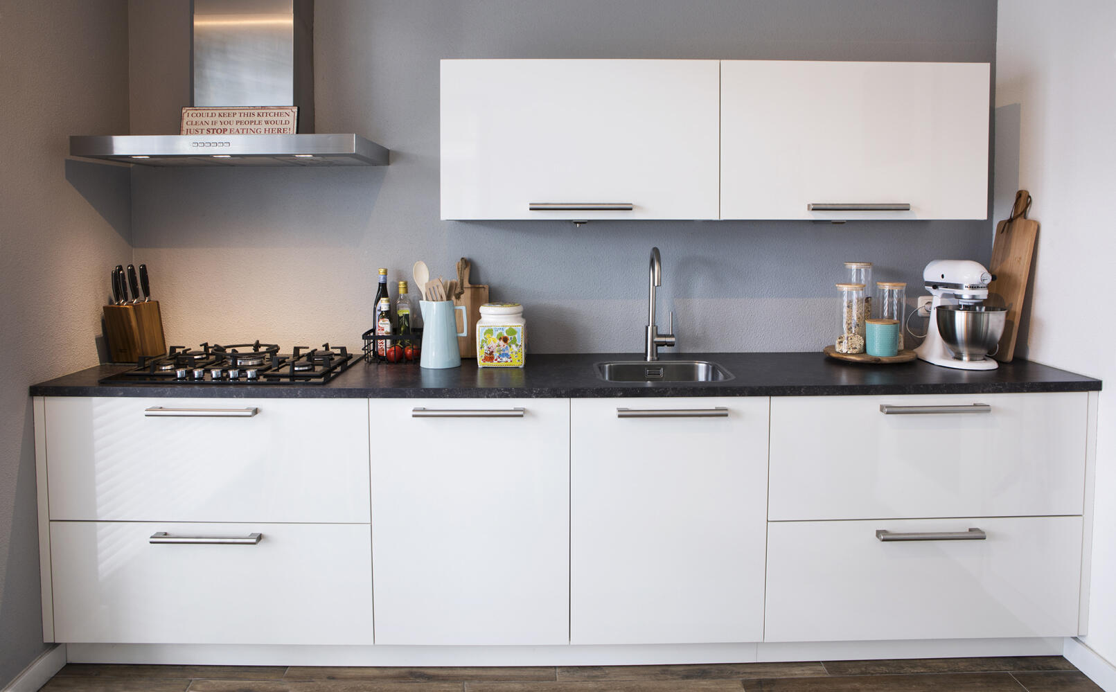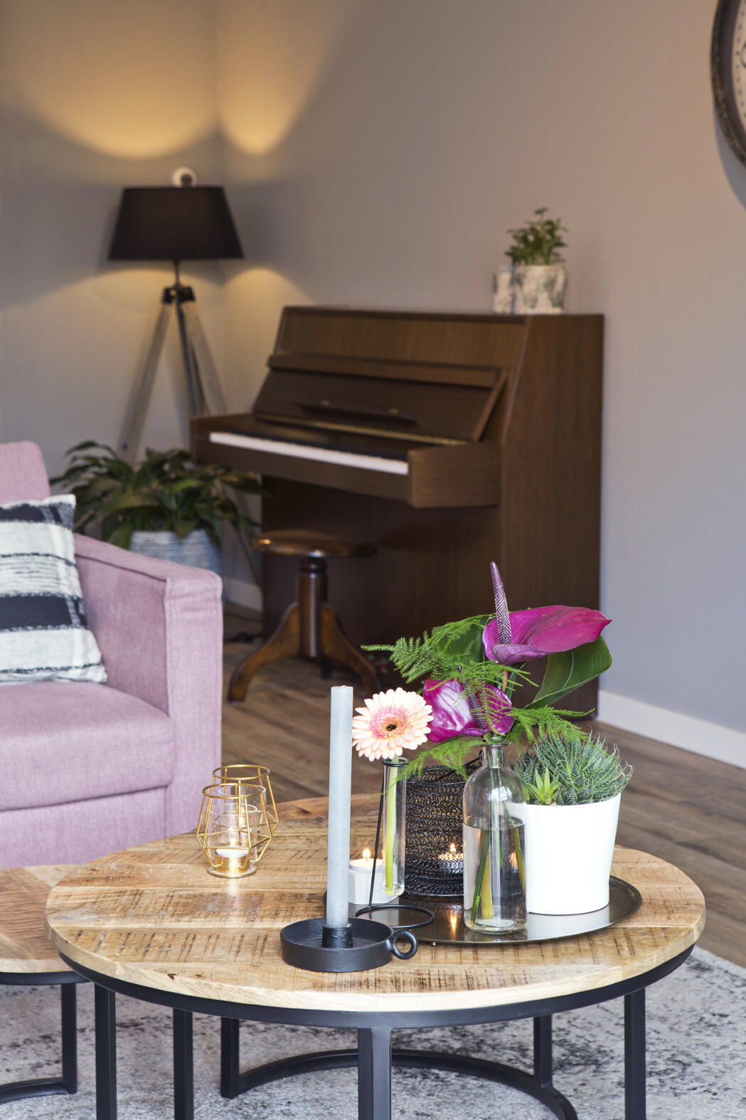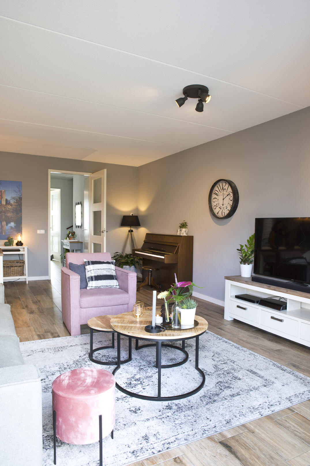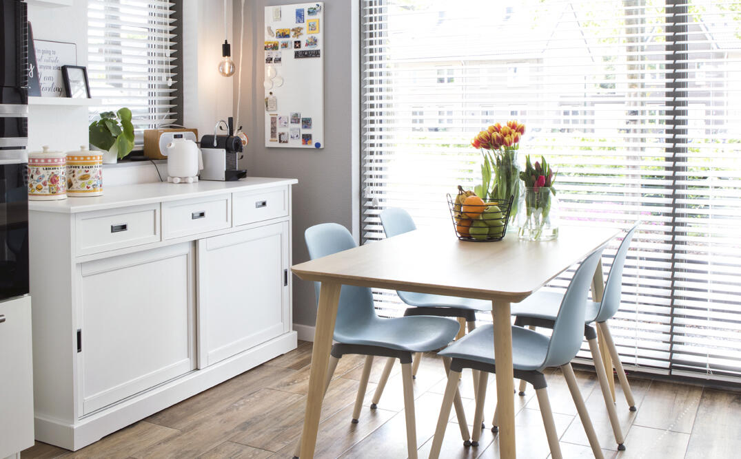 “Voor de kleuren in ons huis hebben we ons laten adviseren. Voor de bank hebben we een groengrijze stoffering gekozen en met het grijze tapijt definieer je dan de zitruimte iets meer. Het roze stoeltje geeft een leuk kleuraccent.” De tafels hebben houten bladen en een metalen onderstel. Op de benedenverdieping zijn de bovenlichten boven de deuren dichtgemaakt. Door de keuze voor een dichte trap is ook ruimte gecreëerd voor een trapkast. De keuken heeft witte fronten met metalen handgrepen en een donker, kunststof aanrechtblad. De houten keukentafel heeft een belangrijke functie. “Dat is echt een heel fijn plekje.”