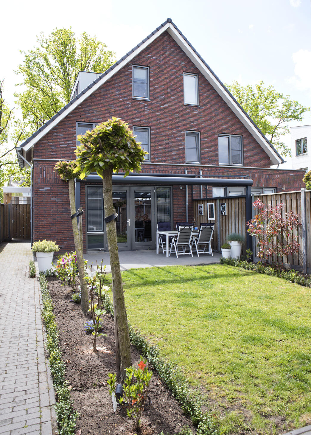 “We waren op zoek naar een grotere woning en het liefst zonder te klussen, dus zo kwamen we bij deze nieuwbouwwoning uit. Deze tweekapper is echt lekker ruim en we hebben alle mogelijkheden benut om ‘m zo groot mogelijk te laten maken. We wonen hier nu erg naar ons zin, het is echt super!” Die uitbreidingsmogelijkheden waren behoorlijk: een uitbouw van 2,40 meter over de volle breedte van de woning aan de achterzijde en een dakkapel in de zijgevel over een lengte van 3,40 meter.