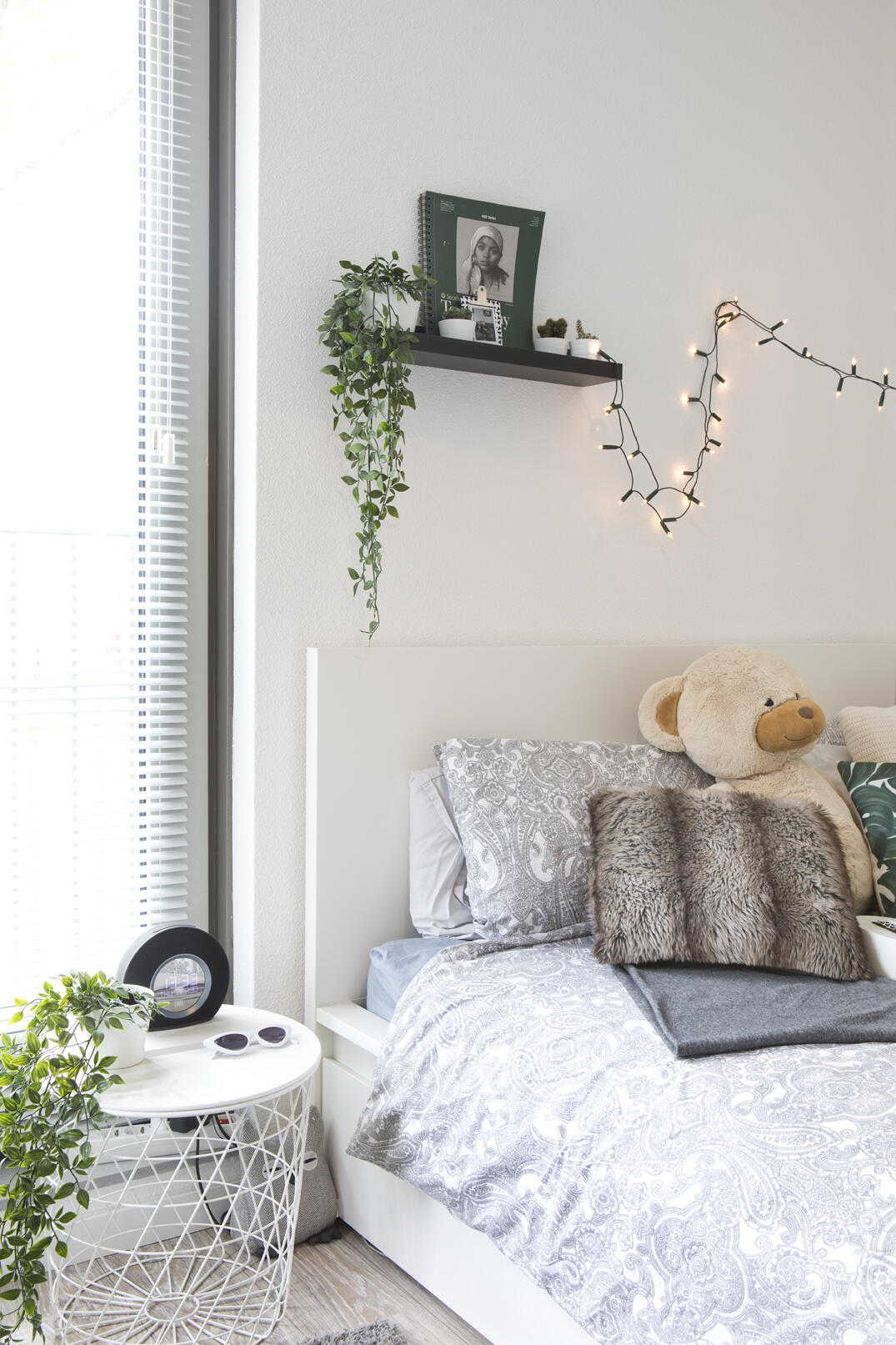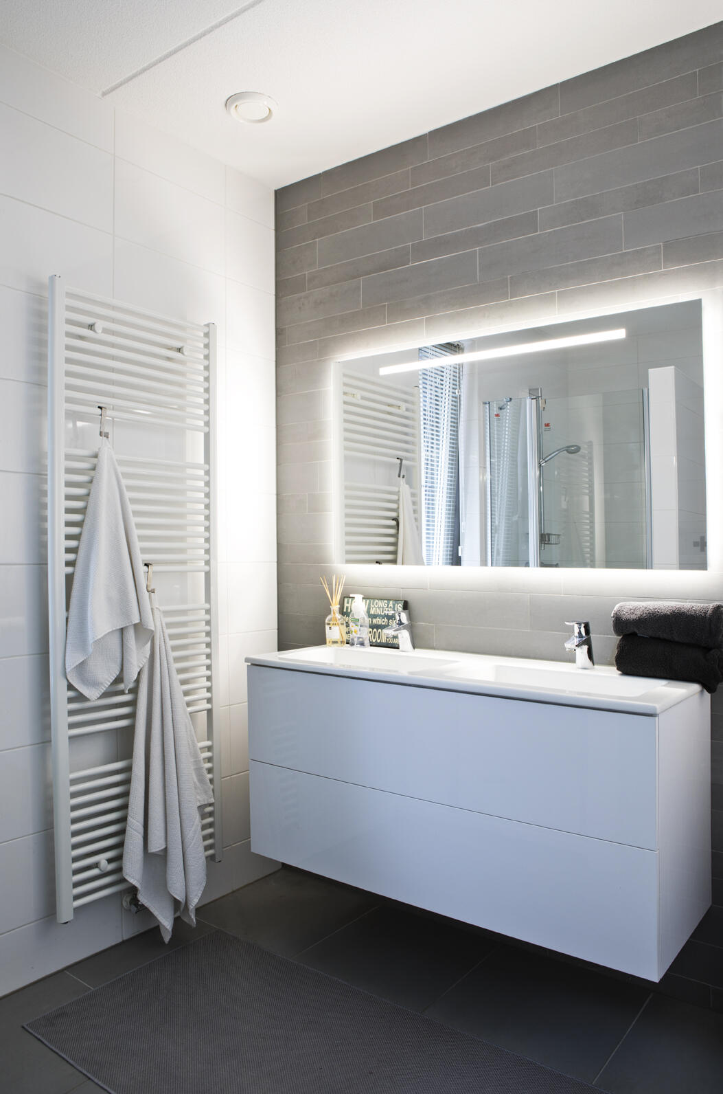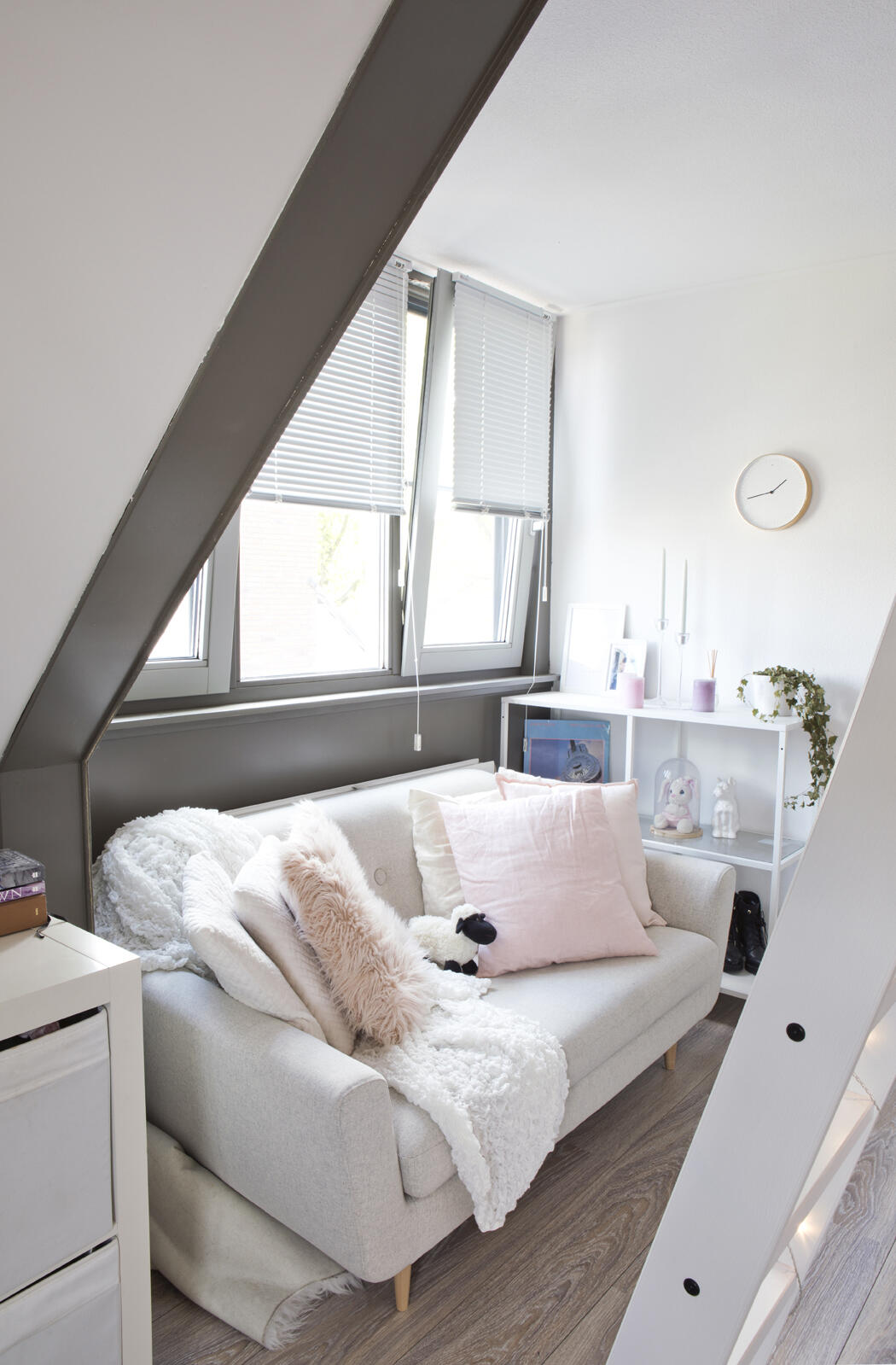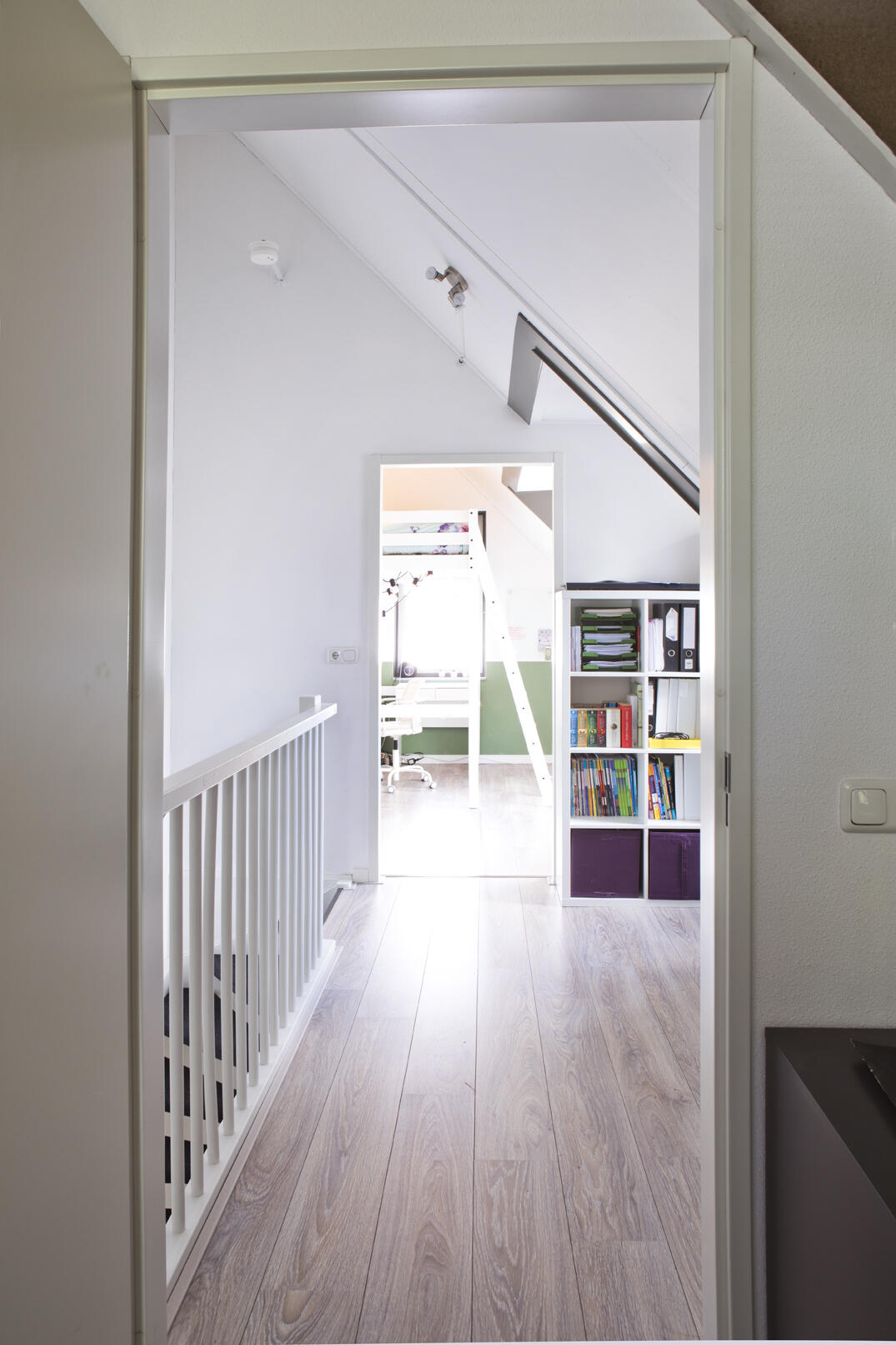 Voor de slaapkamers heeft de familie gekozen voor rustige, neutrale kleuren met houtlaminaat op de vloeren. Op de zolderslaapkamer biedt de dakkapel plaats aan een zitbankje. En dankzij de hoogslaper kan hier ook gewerkt worden. De badkamer - met inloopdouche, dubbele wastafel en toilet - is eveneens uitgevoerd in een overwegend lichte kleur, met donkergrijze vloertegels. “We hebben eigenlijk zo’n beetje alles bij Whoon in het Warenhuys gekocht. Dat is toch makkelijk, je hebt alles in één, je hebt één aanspreekpunt en ze kunnen alles goed laten zien in die fraaie showroom. We zijn super tevreden.