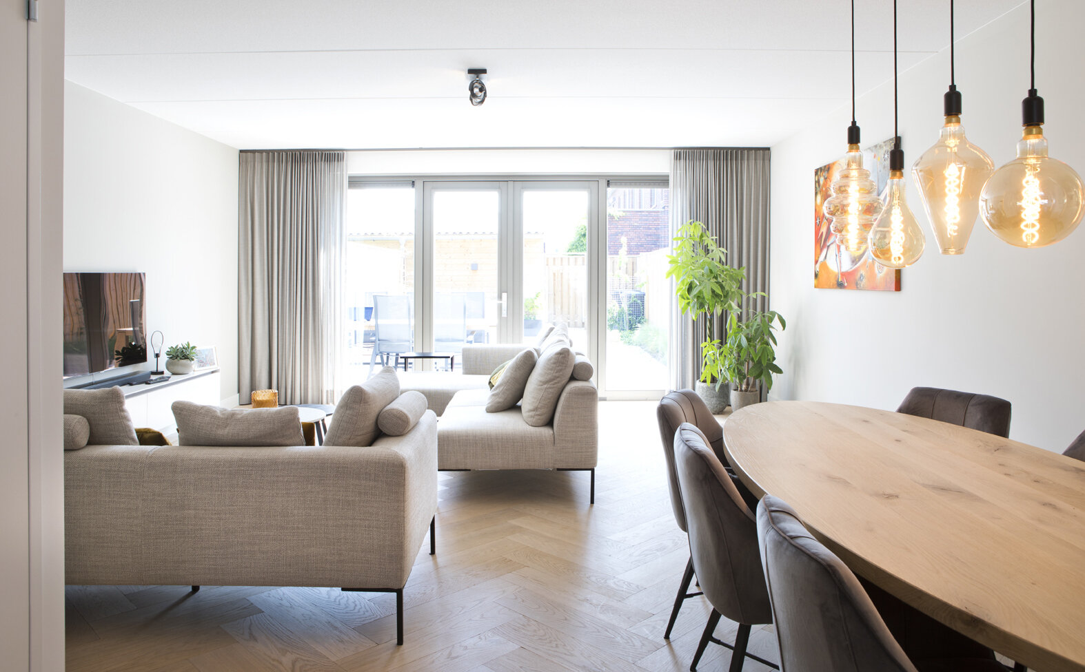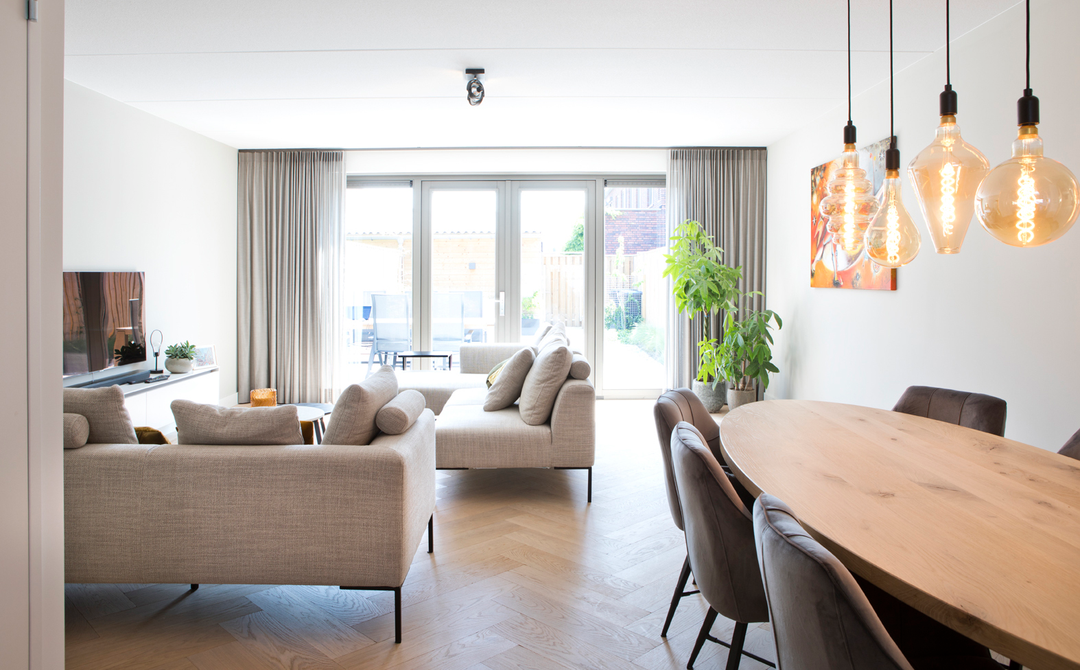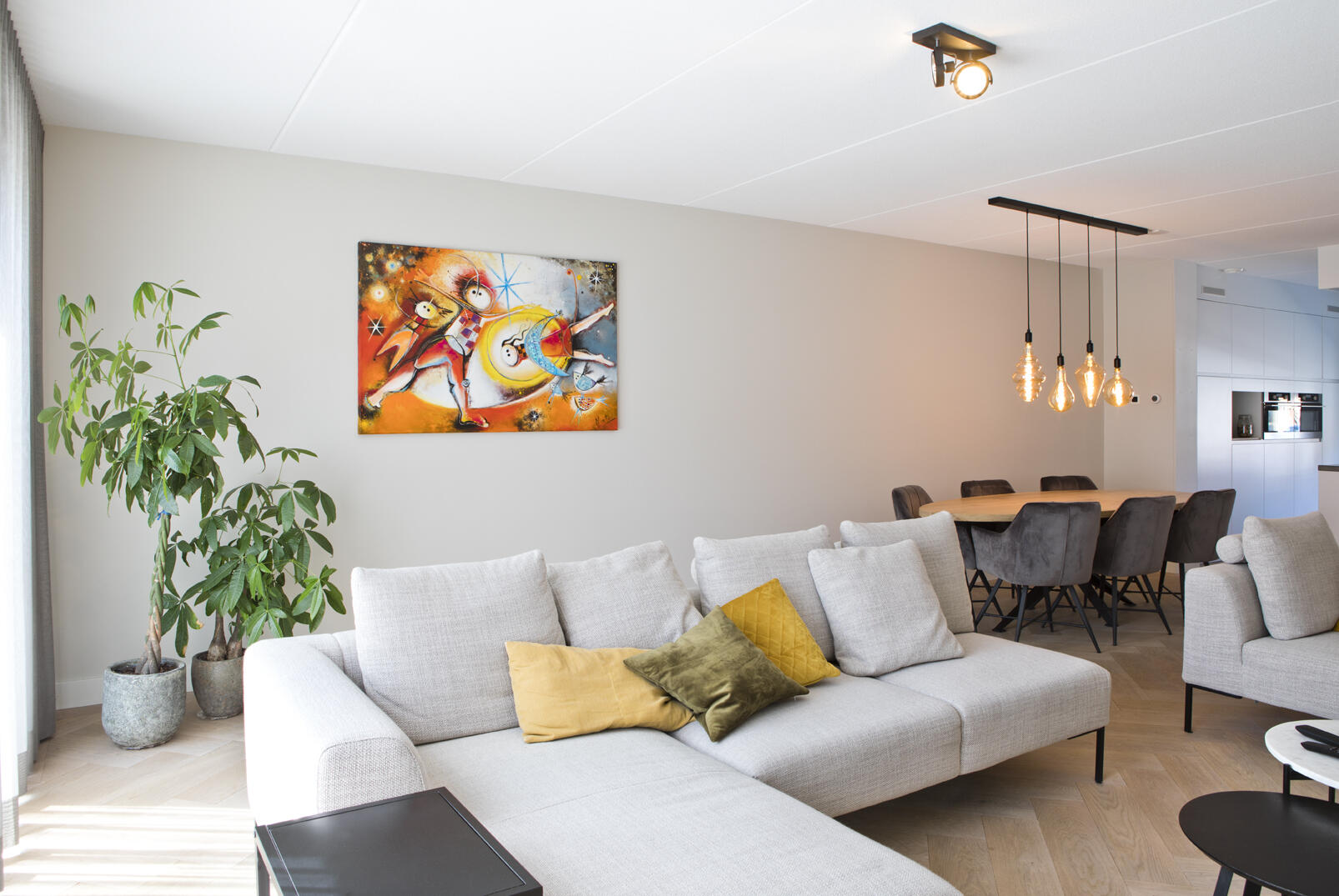Mathijs koos de keuken uit bij Whoon Warenhuys in Waardenburg. In de overgang van keuken naar zithoek heeft hij het houten tafelblad van de eettafel ovaal laten maken om de doorloop zo breed mogelijk te houden. De donker beklede stoelen geven aan de eethoek een warme sfeer, zeker in combinatie met de warmkleurige verlichting.