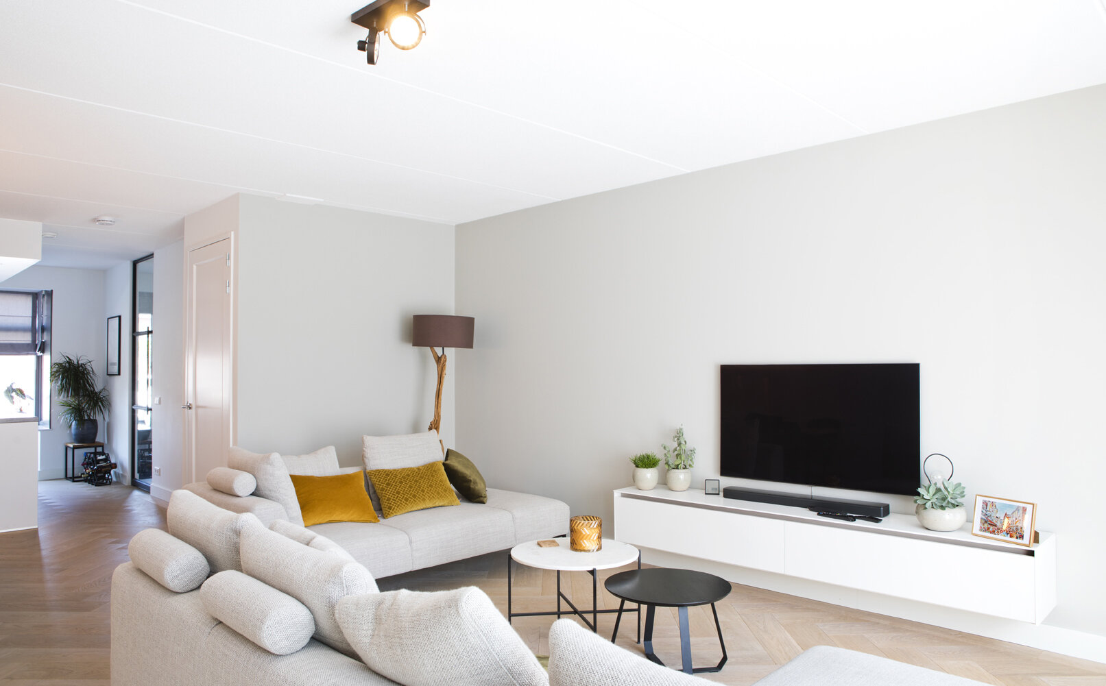 Mathijs koos bij de inrichting van de benedenverdieping voor lichte kleuren, voornamelijk wit- en grijstinten met een enkel donkerder of kleurig accent, zoals de kussens in de zithoek. In combinatie met de lichte, houten visgraat vloer overheerst rust en ruimte in dit interieur. Op de eerste etage beschikt hij over drie slaapkamers en een badkamer met regendouche, gekocht in het Warenhuys van Whoon. Op de grote zolderetage heeft Mathijs twee dakramen laten aanbrengen “voor meer lichtinval en frisse lucht.”