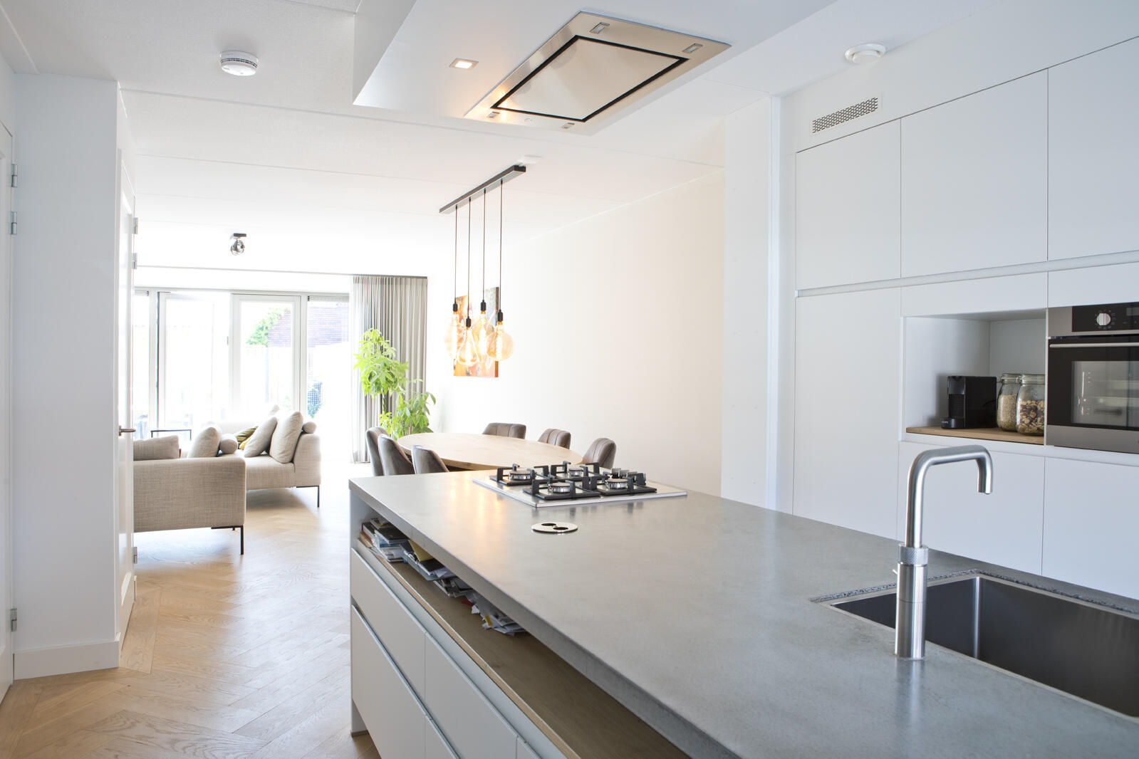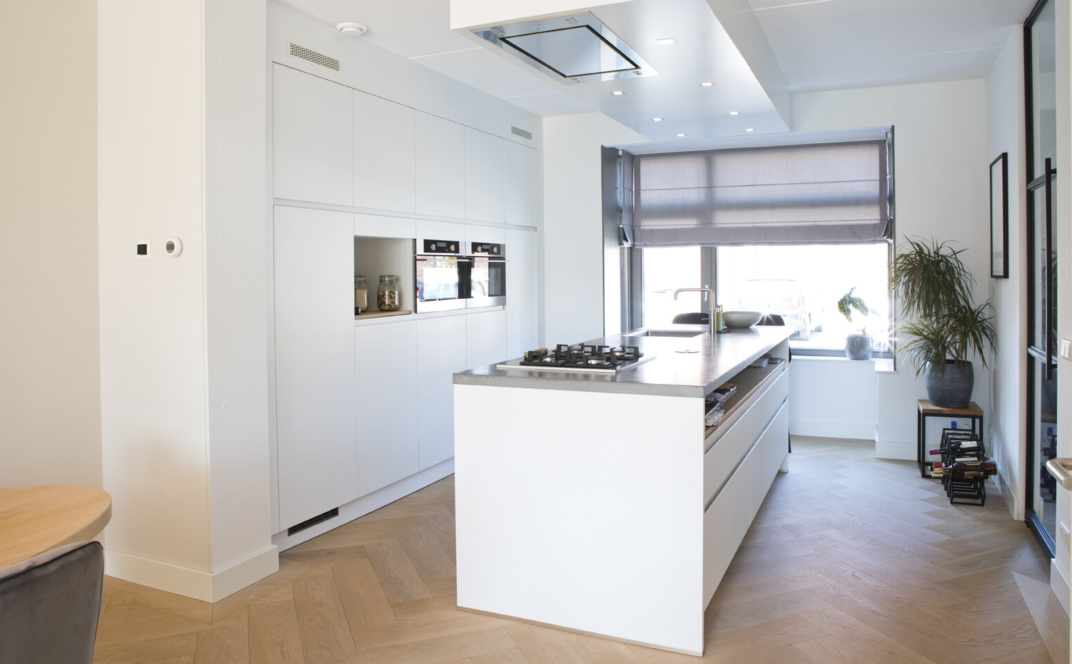 De keuze voor een stalen deur met glas tussen hal en woonkamer draagt eveneens bij aan de sfeer van ruimtelijkheid en licht die Mathijs nastreeft. “Het maakt de keuken meteen een stuk groter.” Een wit kookeiland met grijs werkblad en een grote strakke spoelbak geeft hem volop kans zijn kooktalent te ontplooien. Het kookeiland heeft een barretje met twee krukken aan de kant van de erker aan de voorzijde van de woning. Afzuigkap en lichtspotjes zijn verwerkt in een koof onder het plafond. De bijbehorende royale witte wandkast zorgt voor veel bergruimte en biedt bovendien plek aan een magnetron, een oven en een nisje.