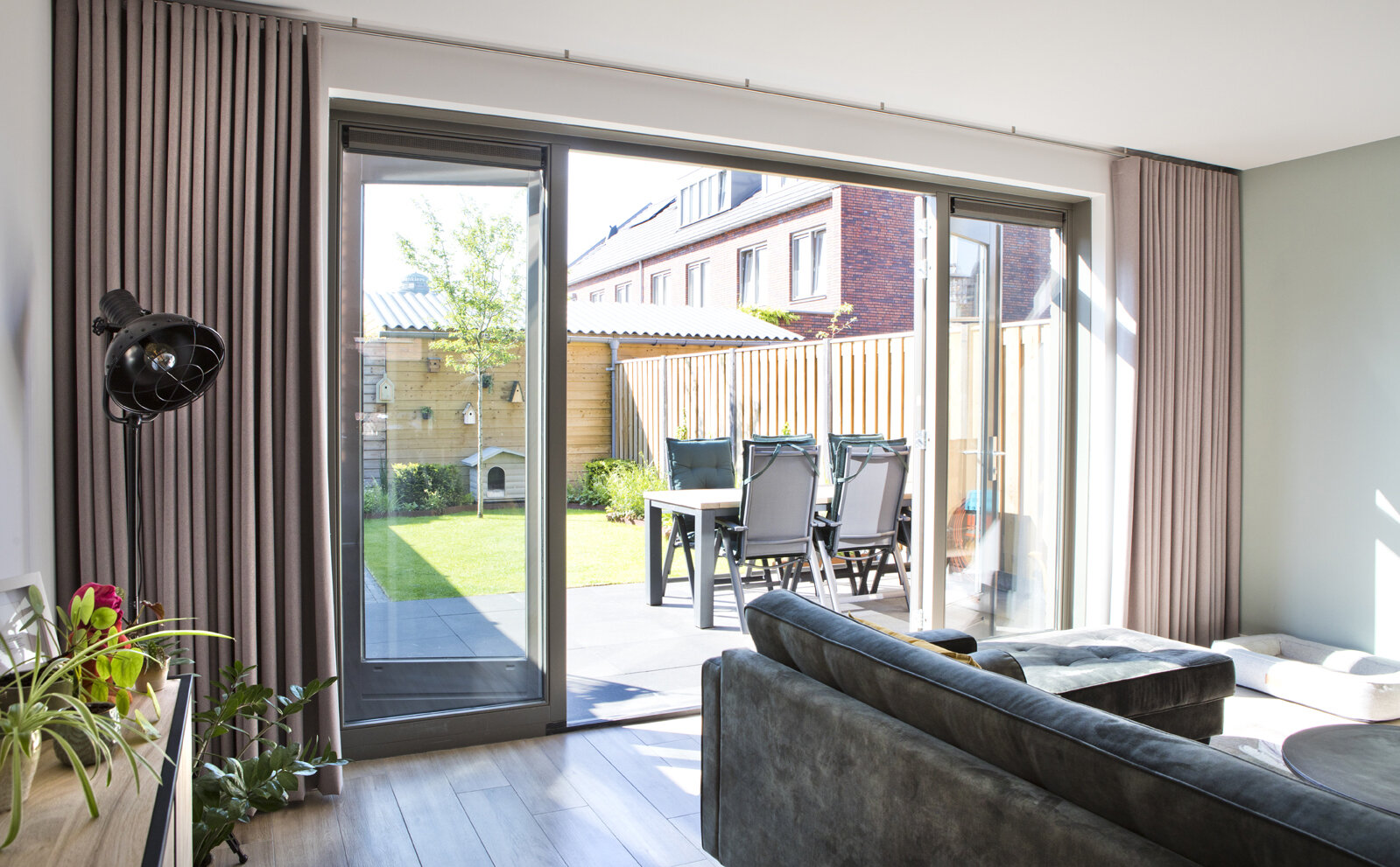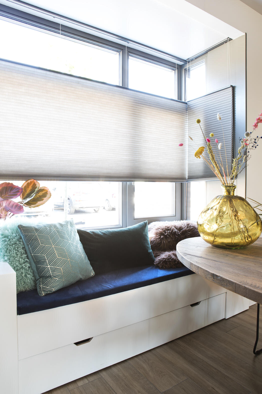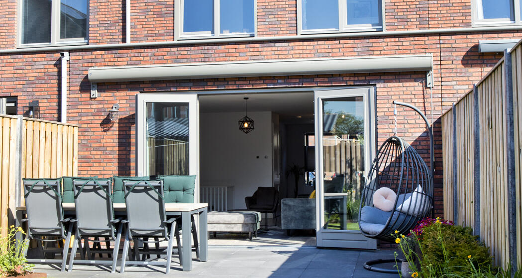 “Hier zitten we eigenlijk het meest en we hebben dankzij die erker een leuk zicht op de straat. De zonwering Duette biedt veel privacy. We hebben die meestal in deze stand staan, zodat we er onderdoor kunnen kijken.”