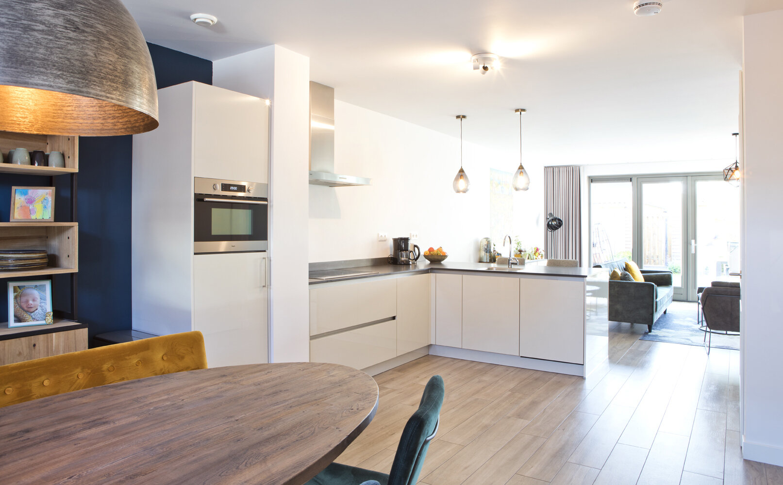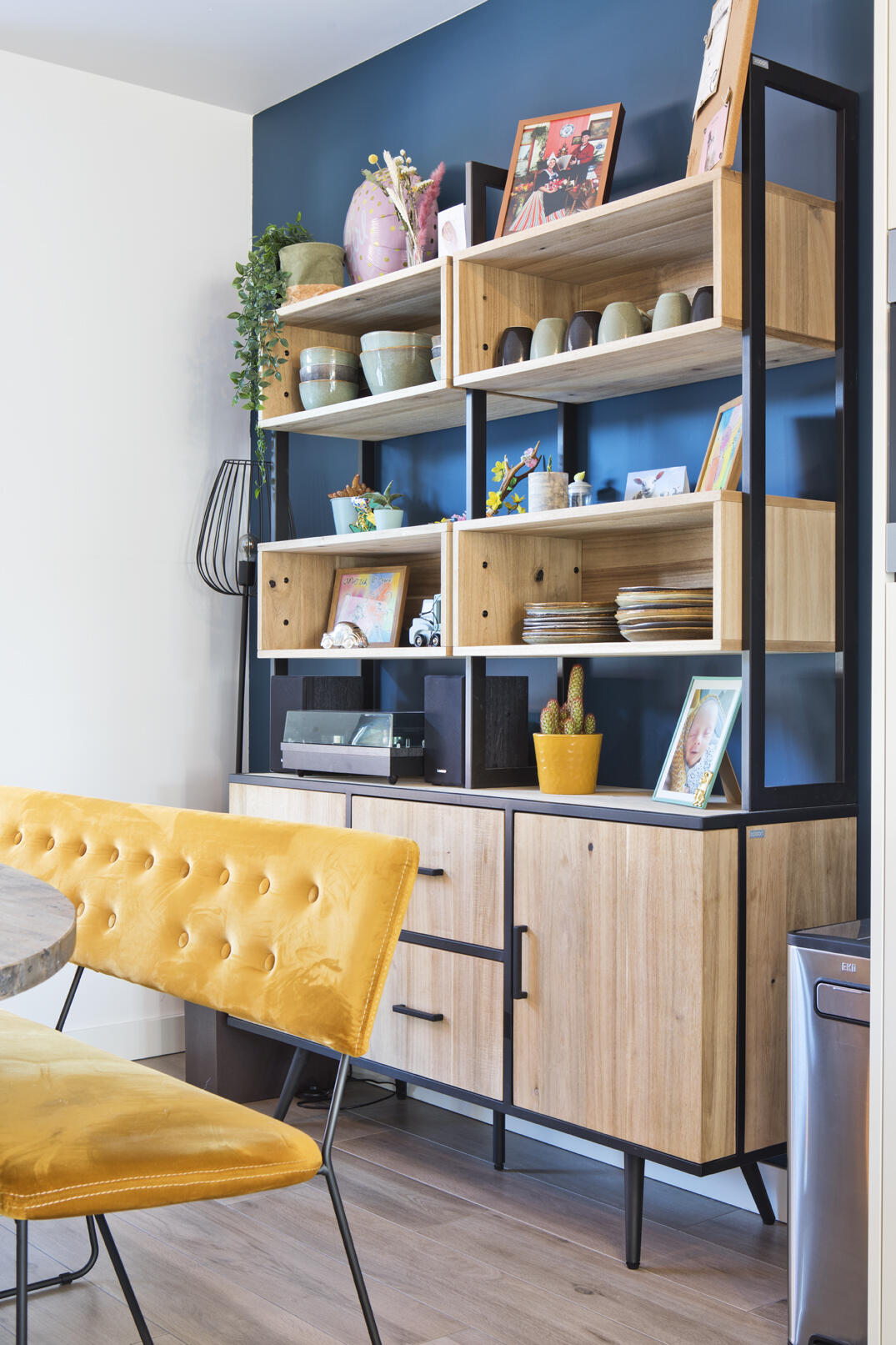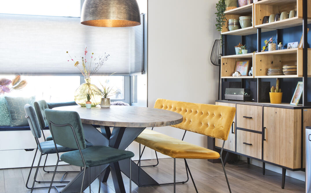 Opvallend is de invulling van de erker aan de voorzijde van de woonkamer met een op maat gemaakte zitbank met bergruimte. Daarvoor staat de ovale eettafel met een houten blad en een metalen onderstel, drie eetkamerstoelen en een geel zitbankje. De grote metalen lamp biedt een accent dat aansluit bij de industriële architectuurstijl van de woningen. De wandkast in dit deel van de woonkamer, gemaakt van hout en metaal, vormt een mooi contrast met het Haags blauw van de wand erachter. De zus van Anouk is interieuradviseur en heeft geadviseerd over de inrichting en de kleurstelling. “Zelf hadden we sommige kleuren misschien niet aangedurfd, maar het is allemaal erg mooi geworden.”