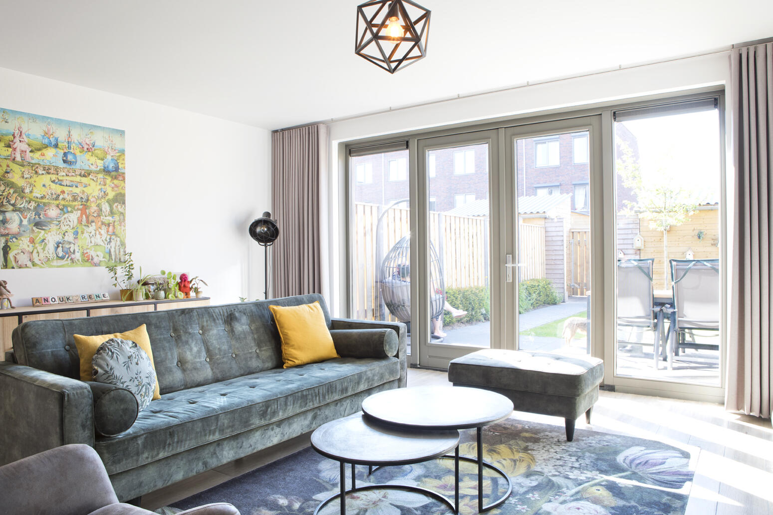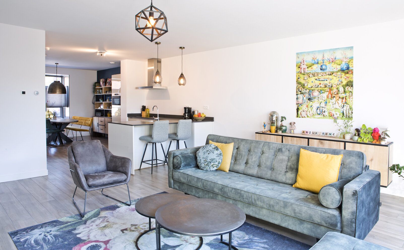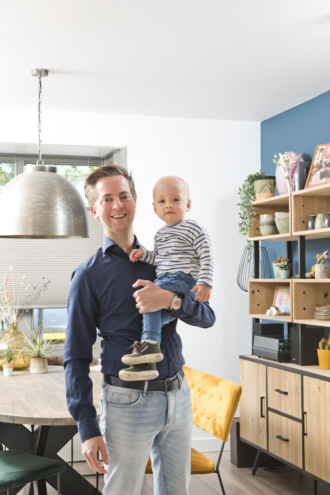 Opvallend is de invulling van de erker aan de voorzijde van de woonkamer met een op maat gemaakte zitbank met bergruimte. Daarvoor staat de ovale eettafel met een houten blad en een metalen onderstel, drie eetkamerstoelen en een geel zitbankje. De grote metalen lamp biedt een accent dat aansluit bij de industriële architectuurstijl van de woningen. De wandkast in dit deel van de woonkamer, gemaakt van hout en metaal, vormt een mooi contrast met het Haags blauw van de wand erachter. De zus van Anouk is interieuradviseur en heeft geadviseerd over de inrichting en de kleurstelling. “Zelf hadden we sommige kleuren misschien niet aangedurfd, maar het is allemaal erg mooi geworden.”
