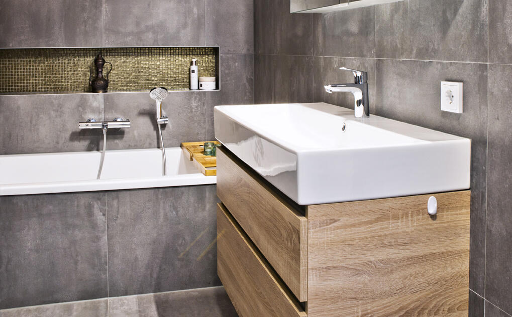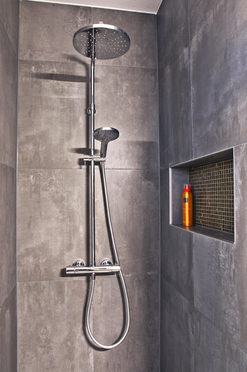 Op de eerste etage is de badkamer iets vergroot, omdat Anouk en René zowel een bad als inloop-regendouche wilden. Om een stoere uitstraling te verkrijgen is gekozen voor een grote tegel in betonlook, een vloertegel die ook op de wanden is toegepast. De eerste verdieping bevat verder drie slaapkamers en op de zolder is een vierde kamer gerealiseerd. “Dat is een hele fijne lichte kamer geworden, omdat we 4 dakvensters hebben laten aanbrengen.”