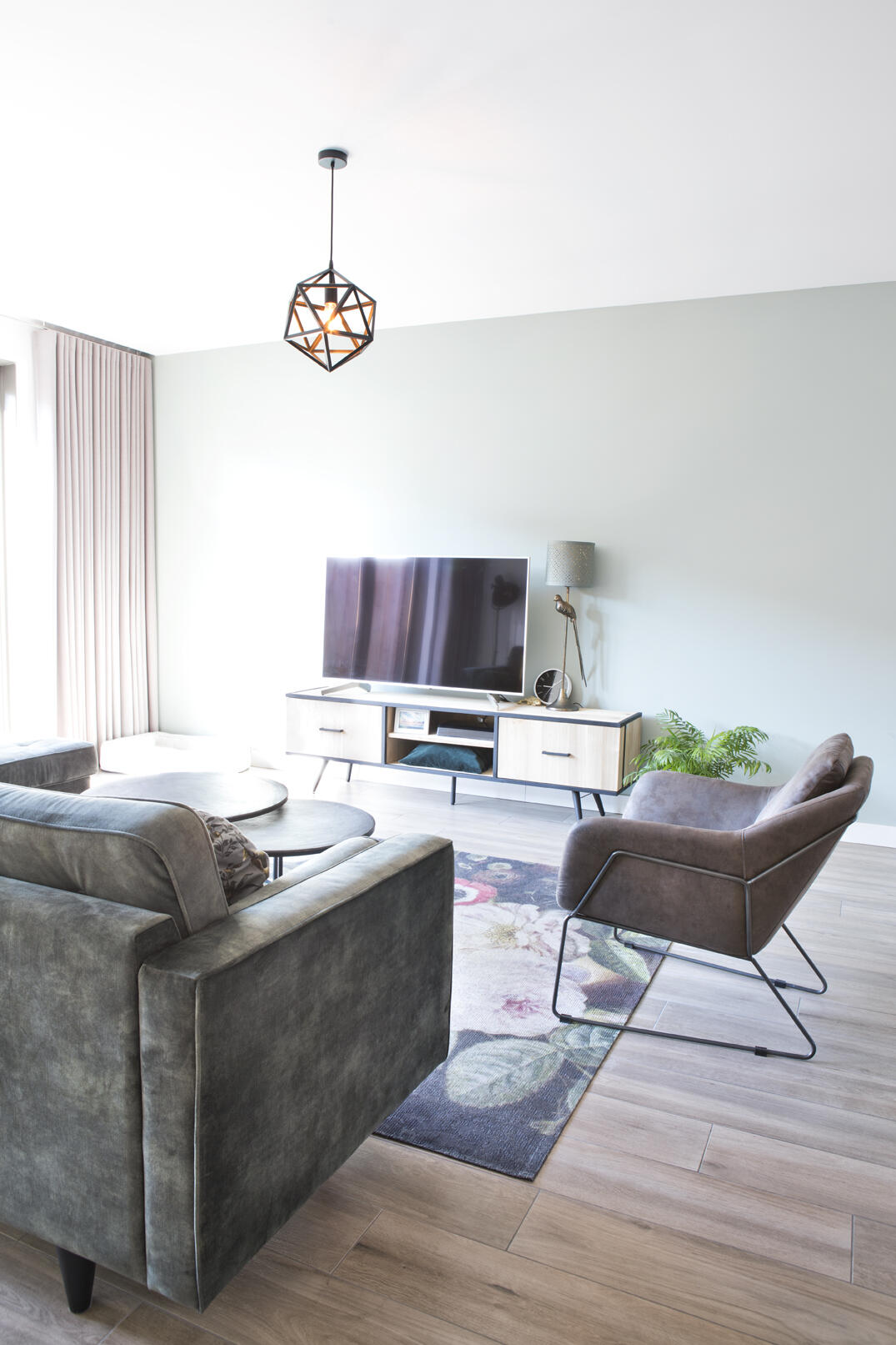 De zithoek is heerlijk ruim, ook dankzij de uitbouw; de donkergroene bank en bijbehorende poef nodigen uit om lekker tv te kijken. “Het gebloemde tapijt maakt het echt helemaal af, vinden wij.” Ook de kleur ‘early dew’ voor de lange wand achter de televisie past mooi in het kleurenpalet. Er is alles aan gedaan om de woonkamer zo strak mogelijk te houden: geen bovenlichten boven de deuren, stopcontacten zo laag mogelijk en een glad afgewerkt plafond. Op de vloer een fraaie tegelvloer in houtlook.