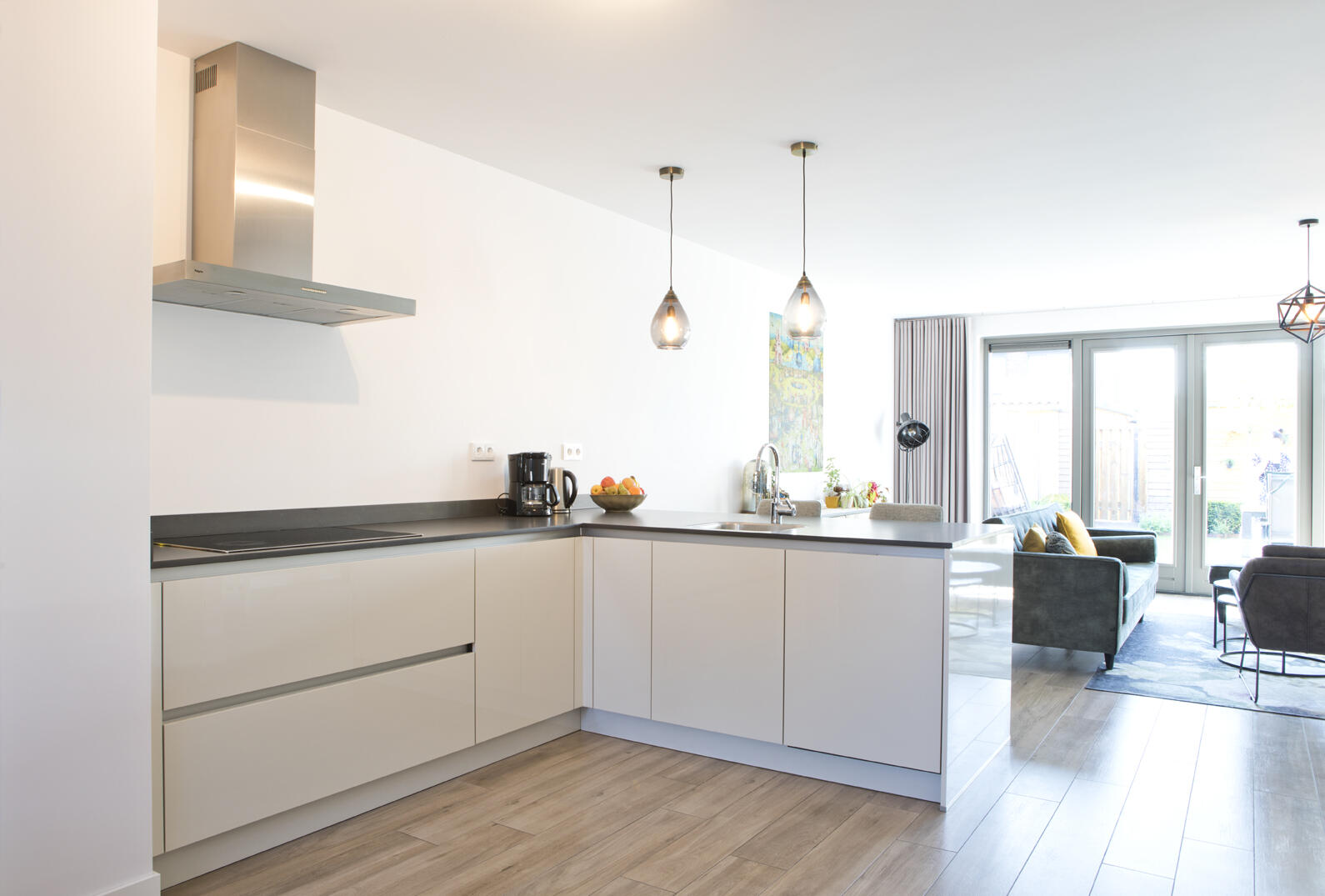 In het midden van de kamer is de strakke, helderwitte keuken met zwart werkblad in L-vorm gepositioneerd. Anouk en René kozen voor een opstelling zonder bovenkastjes om een open overgang naar de zithoek te realiseren.