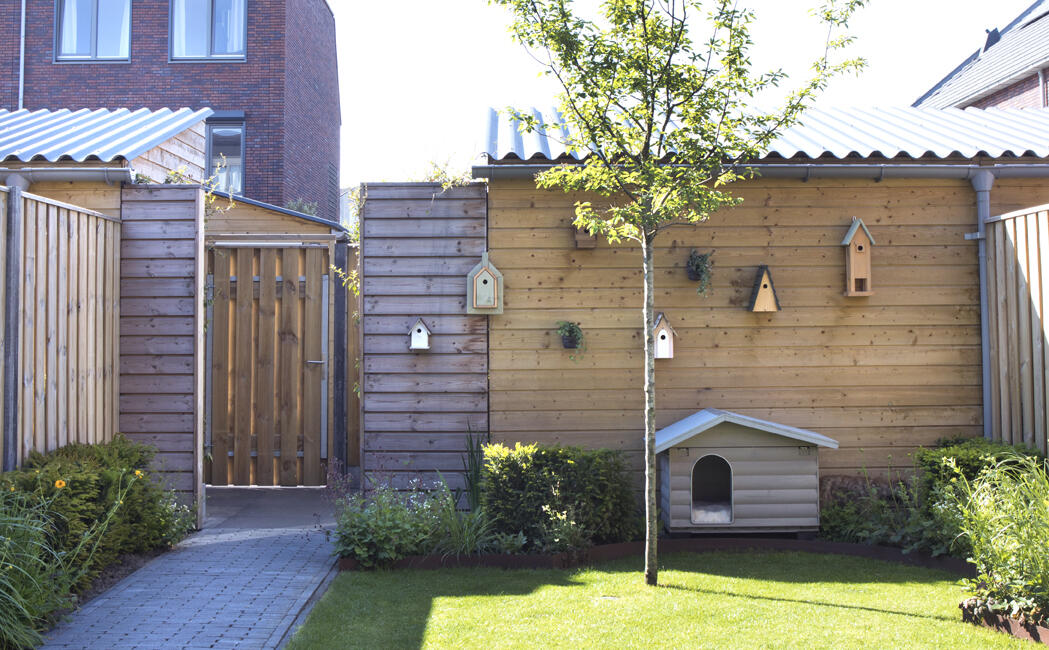 In de achtertuin tenslotte hebben Anouk en René een opvallende cortenstalen borderrand aangebracht om aan te sluiten bij de industriële sfeer en een beplanting waarin ieder seizoen een andere kleur overheerst. Behalve een hondenhok biedt de tuin veel woonruimte voor vogeltjes.