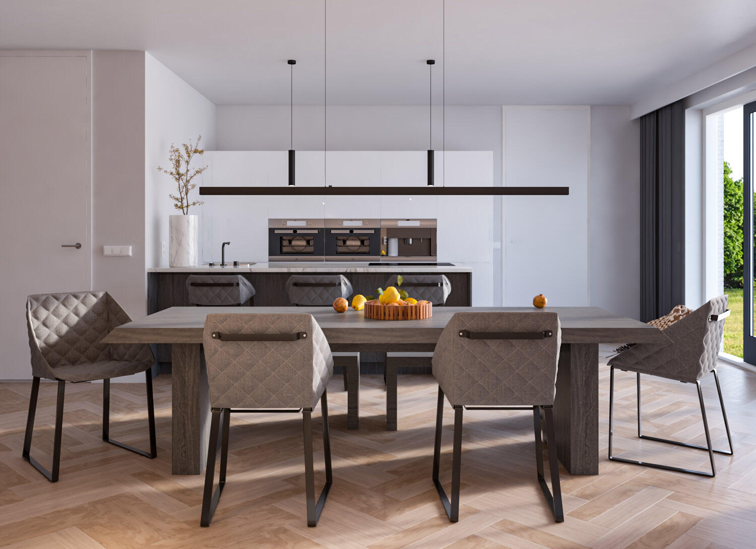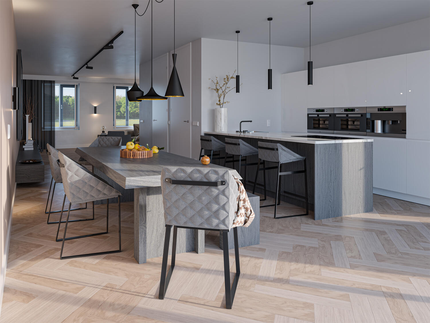 De indeling is bijzonder praktisch met beneden een hal met toilet en garderobe, een lichte L-vormige woonkamer, een open keuken met ruime eethoek. De begane grond kan vergroot worden met een uitbouw van 1.20 of 2.40 meter, waarbij de keuken eventueel naar de voorzijde verplaatst kan worden. Met de optie om de garage te verlengen en/of te splitsen in een berging en een ruimte bij de woning te betrekken, creëer je extra veel leefruimte op de begane grond.