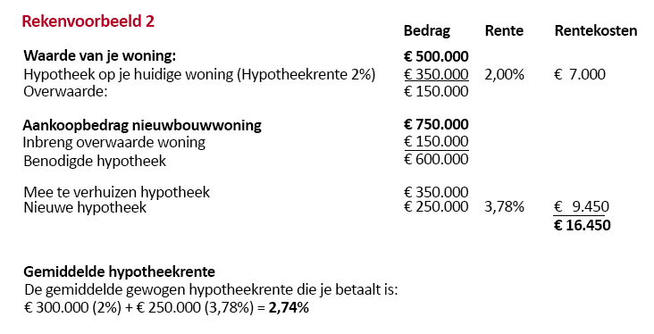 Met de rente van nu lijkt het bijna in alle gevallen interessant om je huidige rente mee te verhuizen, als dit tenminste in de algemene voorwaarden van je geldverstrekker is toegestaan. Toch is dit per situatie verschillend. Of het voor jou interessant is, hangt af van bijvoorbeeld de hoogte van de rente van je huidige hypotheek en de haalbaarheid van je hypotheek voor je nieuwbouwwoning.