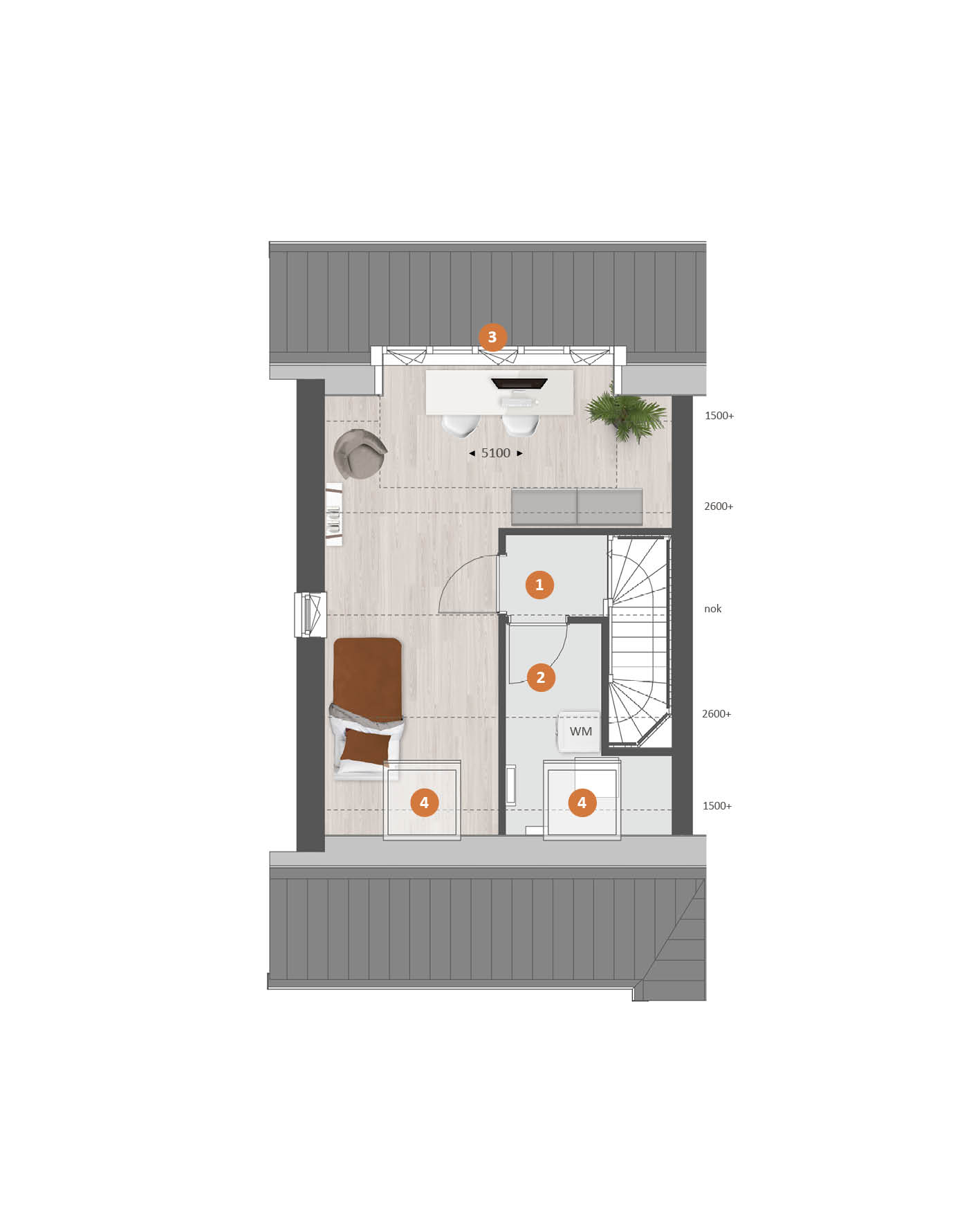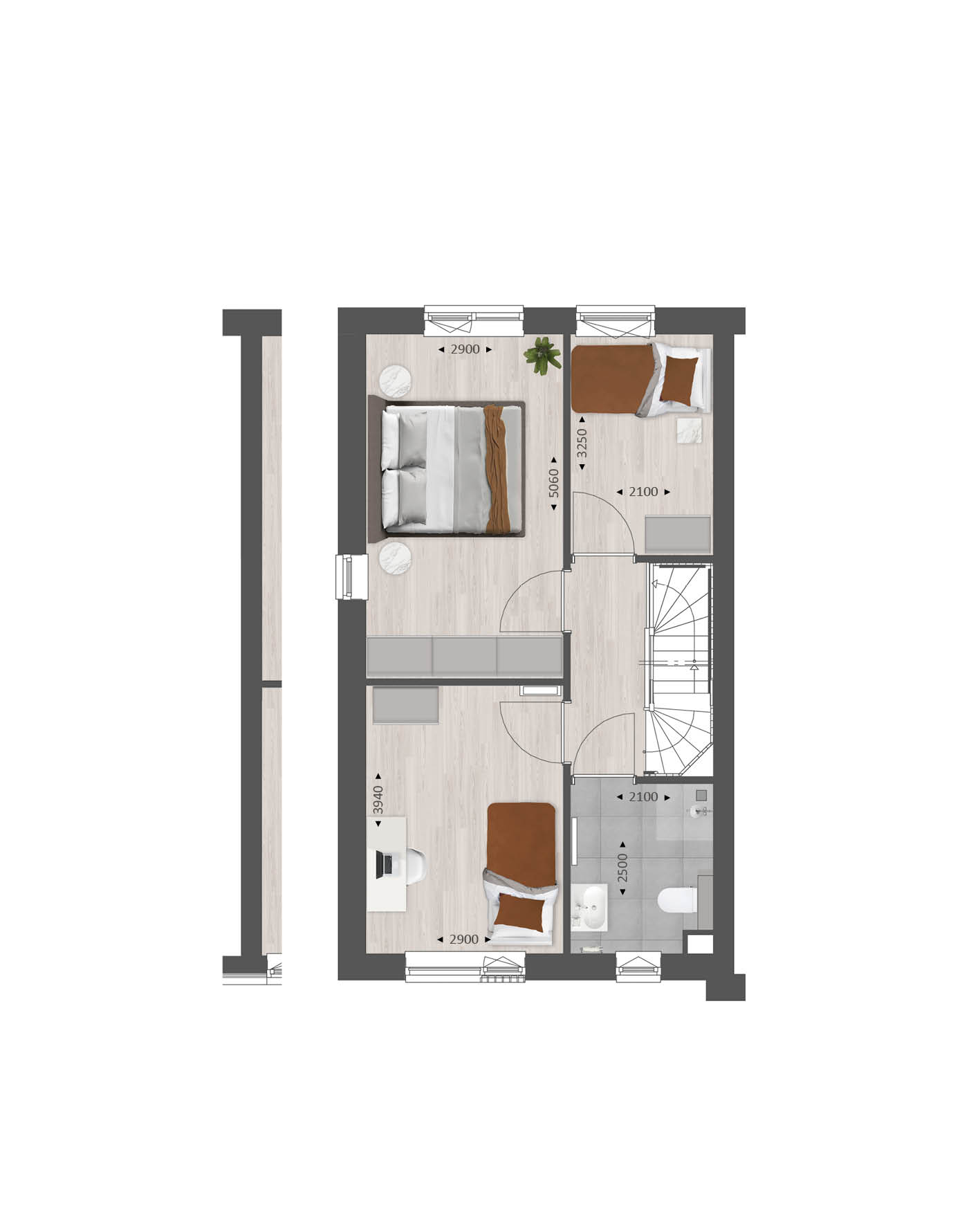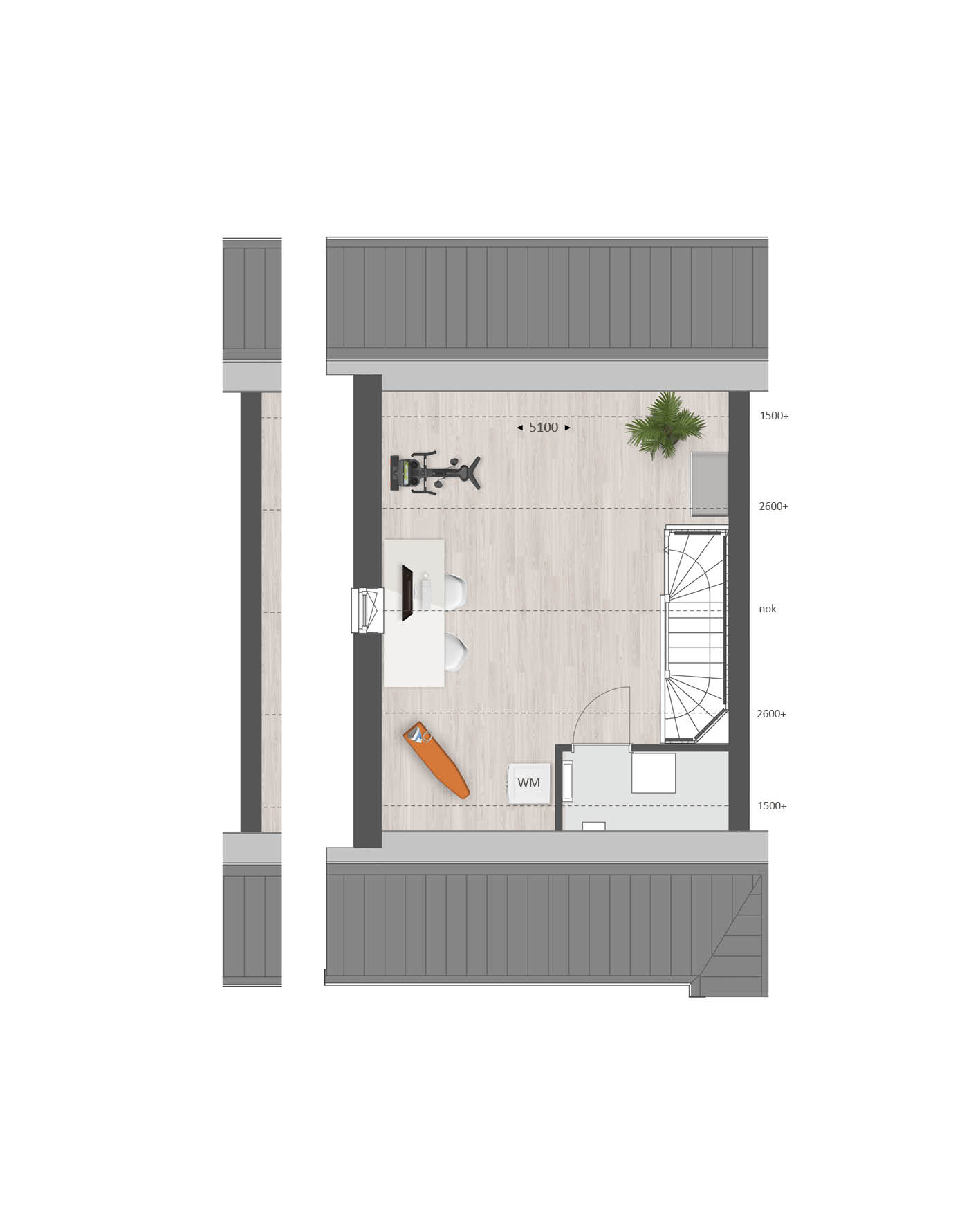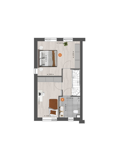 De tweede verdieping biedt je een zee aan ruimte. Hier vind je de aansluitingen voor de wasapparatuur en heb je de mogelijkheid om een aparte wasruimte te maken en een thuiskantoor of extra slaapkamer met dakkapel aan de voor- én/of achterzijde.