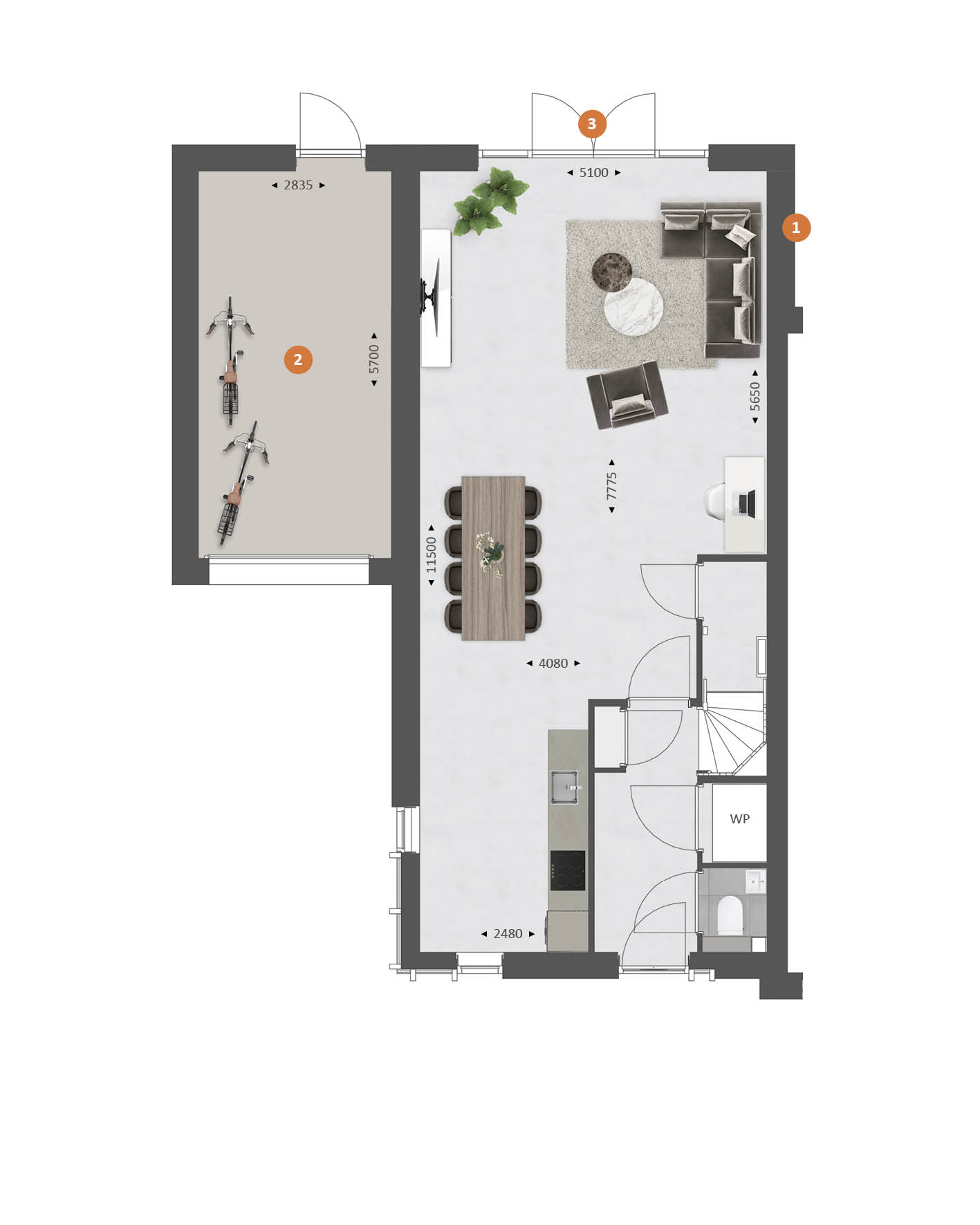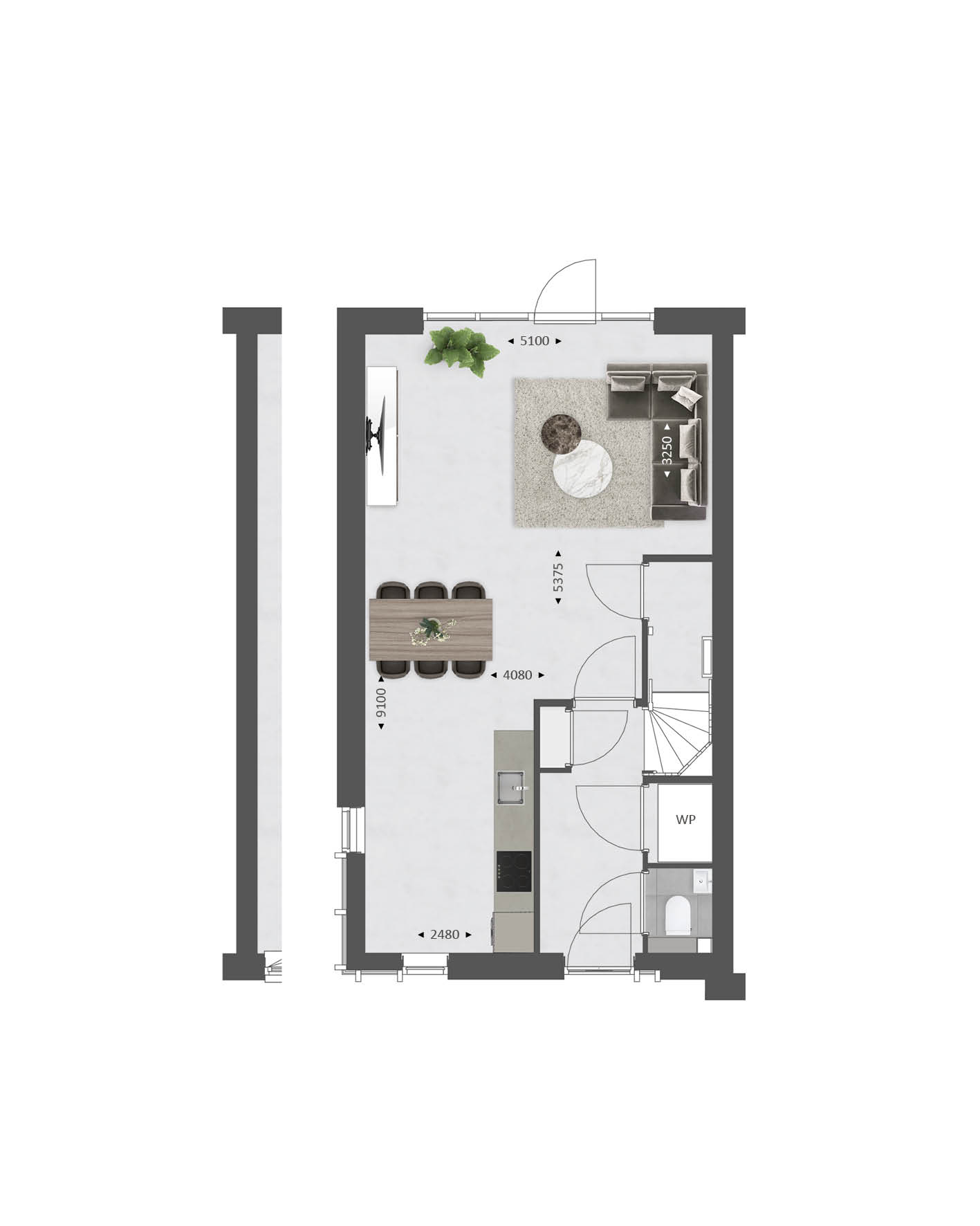 De indeling is bijzonder praktisch met beneden een hal met toilet en technische ruimte, een lichte tuingerichte woonkamer en een open keuken met zicht op de straat. TIP: Maak de woonkamer nóg groter met de optie om deze met 1.20m of 2.40m uit te breiden. De optie voor openslaande tuindeuren zorgen voor veel contact met de achtertuin.